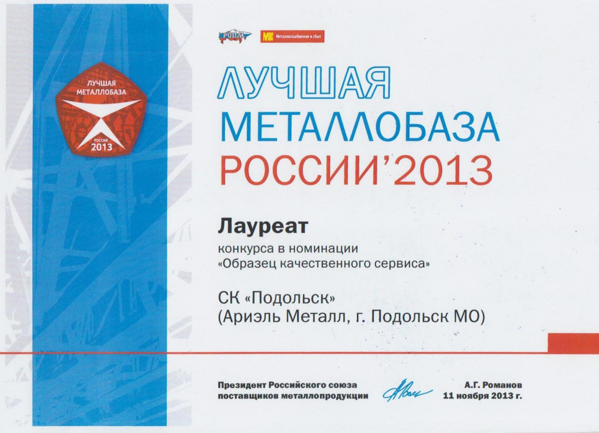 Лучшая металлобаза России2009 «За высокую динамику развития» СК «Подольск» 9 ноября, Москва