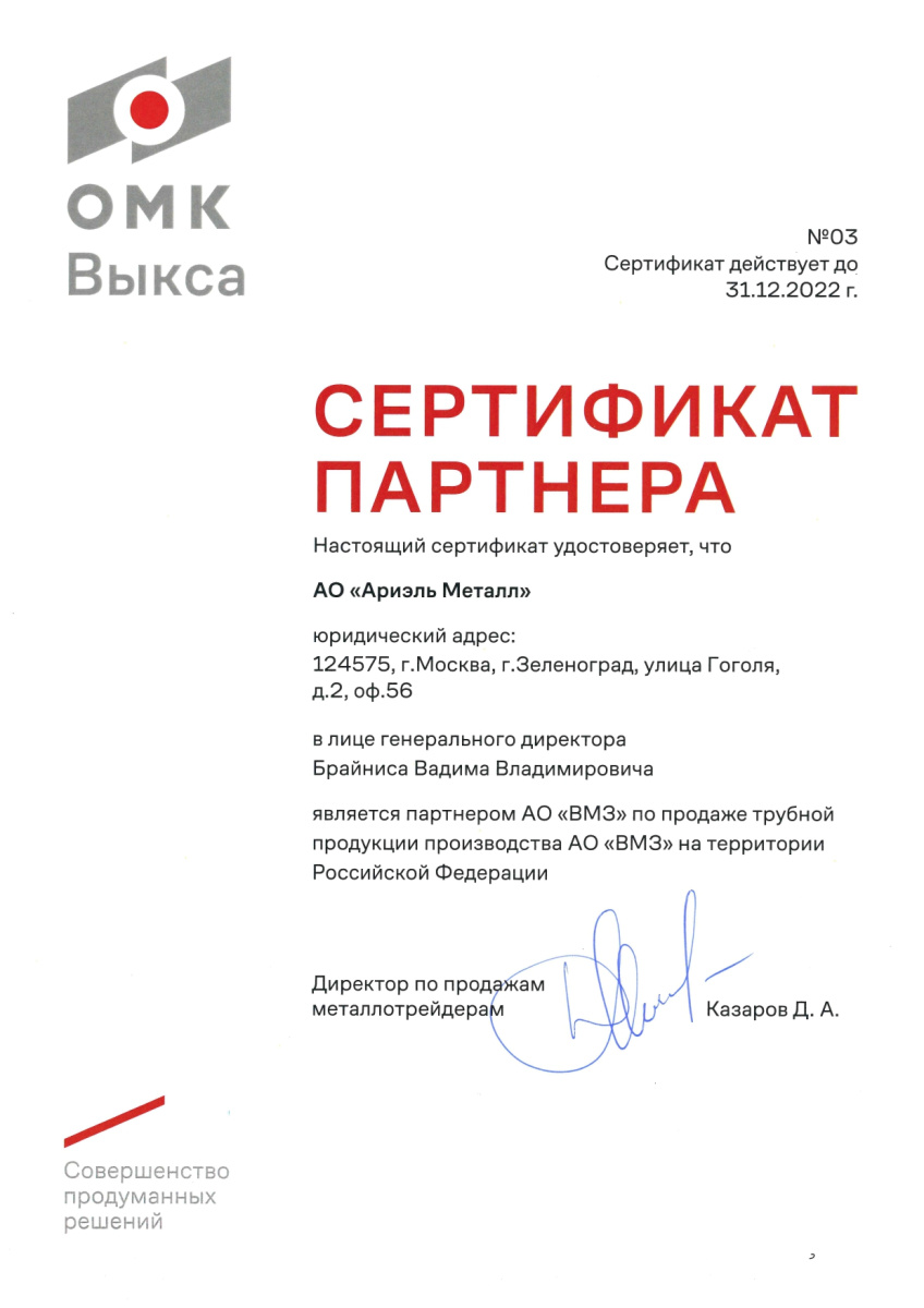 Сертификат дилера АО "ВМЗ" 2022 г.