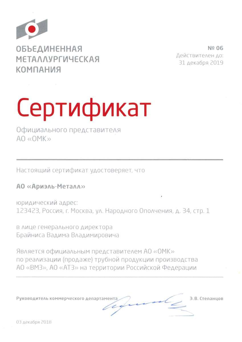 Сертификат партнера Публичного акционерного общества "Ашинский металлургический завод"
